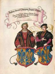 Keywords: Fugger Ehrenbuch 072.jpg Geheimes Ehrenbuch der Fugger hergestellt in der Werkstatt Jörg Breu d J 1545 “1549<br /> Portrait- und Wappendarstellung http //daten digitale-sammlungen de/~db/0004/bsb00042105/images/ 1545 “1549 workshop PD-old-100 Geheimes Ehrenbuch der Fugger Portraits in Geheimes Ehrenbuch der Fugger Coats of arms in Geheimes Ehrenbuch der Fugger Coats of arms of Fugger von der Lilie family |