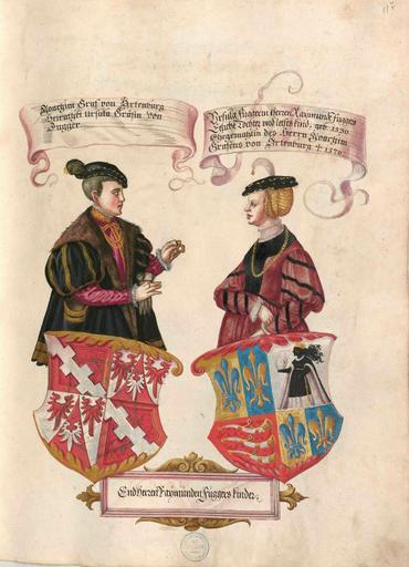 Keywords: Fugger Ehrenbuch 117.jpg Geheimes Ehrenbuch der Fugger hergestellt in der Werkstatt Jörg Breu d J 1545 “1549<br /> Portrait- und Wappendarstellung http //daten digitale-sammlungen de/~db/0004/bsb00042105/images/ 1545 “1549 workshop PD-old-100 Geheimes Ehrenbuch der Fugger Portraits in Geheimes Ehrenbuch der Fugger Coats of arms in Geheimes Ehrenbuch der Fugger Coats of arms of Fugger von Kirchberg und Weißenhorn family Schaube Coats of arms of Ortenburg family Joachim von Ortenburg Ursula von Fugger |