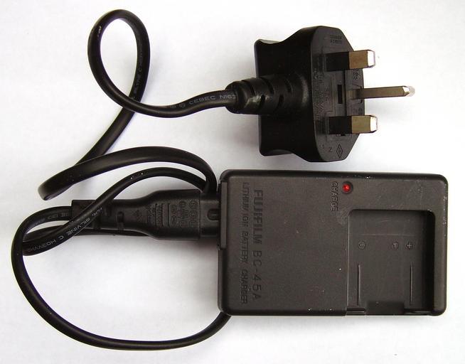 Keywords: FujifilmJ25Charger.JPG en The battery charger Fujifilm BC-45A supplied with a Fujifilm Finepix J25 own Simon Speed 2013-10-09 Fujifilm FinePix J25 Battery chargers Photos by Simon Speed Taken with Pentax Optio 60 Cc-zero