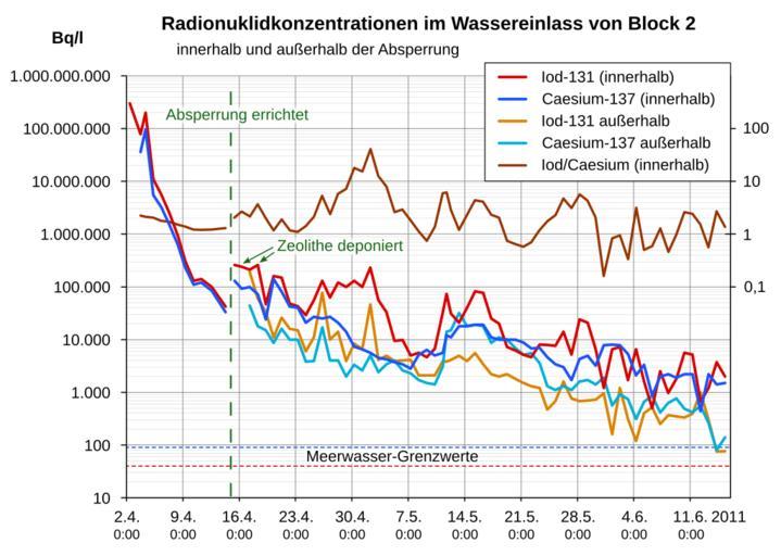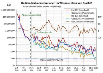 Keywords: Fukushima I Unit 2 inlet water contamination.svg de Kernkraftwerk Fukushima I Iod-131- und Caesium-137-Konzentrationen im und vor dem Wassereinlass von Block 2; Datenquellen http //www tepco co jp/en/press/corp-com/release/index-e html Tepco-Meldungen für Messwerte http //www nisa meti go jp/english/ NISA-Berichte für Ereignisse own PM3 2011-06-16 Cc-zero Water contamination graphs relating to Fukushima I accidents |