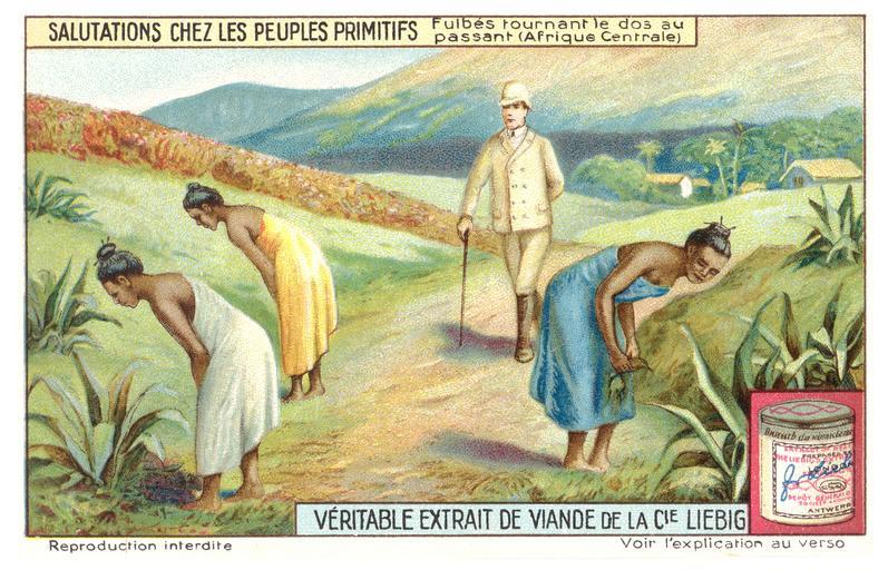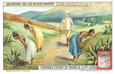 Keywords: Fula greeting ritual.jpg Fula Greeting Ritual Liebig Chromos 1910 author PD-old Fula people Bowing Collectible cards of Liebig's Extract of Meat Company 1910 advertisements Leaning people in art Greetings Colonialism