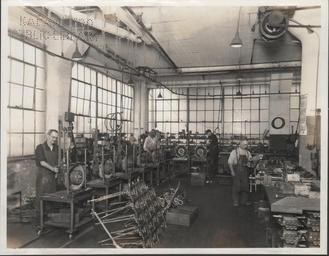Keywords: kalamazoo public library michigan history photography manufacturing factory workers fuller company automobile assembling transmission monochrome Fuller Manufacturing Company, new assembling line. Original photograph caption reads, "This company is famous for its 'five speeds forward' five speed transmissions. About 1800 transmissions per month are manufactured." Photo shows several unidentified workers. KPL catalogue number P-41. Fuller Manufacturing Company, new assembling line. Original photograph caption reads, "This company is famous for its 'five speeds forward' five speed transmissions. About 1800 transmissions per month are manufactured." Photo shows several unidentified workers. KPL catalogue number P-41. |