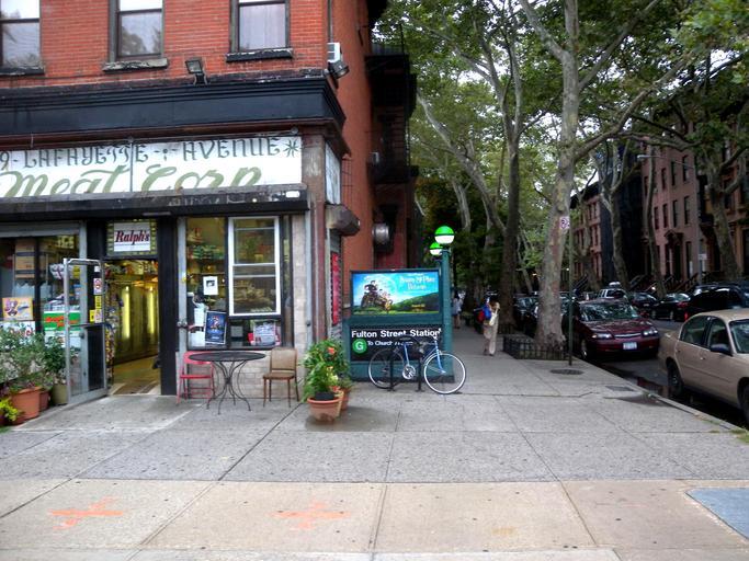 Keywords: Fulton St G sta Moes jeh.jpg en Looking north across Lafayette at stair for Fulton Street station on a rainy afternoon own Jim henderson 2010-08-22 40 41 13 7 N 73 58 28 8 W alt 0_source exif_heading NbW Cc-zero Fulton Street IND Crosstown Line |