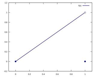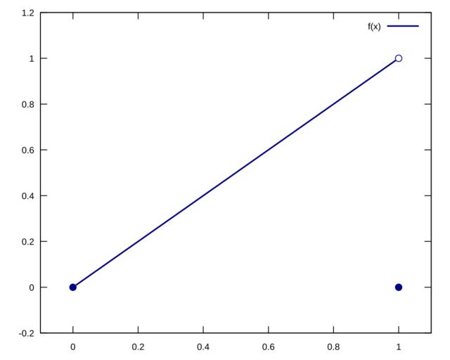 Keywords: Function x for x smaller 1 and 0 for x equal 1.svg en Function <math>f 0 1 \to \R</math> mit <math>f x \begin cases x \text falls x \neq 1 \\ 0 \text falls x 1 \end cases </math> 2016-08-31 own Who2010 other versions Created with Gnuplot set terminal svg set output Function x for x smaller 1 and 0 for x equal 1 svg set xrange -0 1 1 1 set yrange -0 2 1 2 set object 2 circle at 1 0 size 0 01 fc navy fs solid set object 1 circle at 1 1 size 0 01 fc navy set object 3 circle at 0 0 size 0 01 fc navy fs solid f x 0< x x<1 x 1/0 plot f x with lines ls 1 lw 2 fc navy cc-zero Function plots Piecewise linear functions |