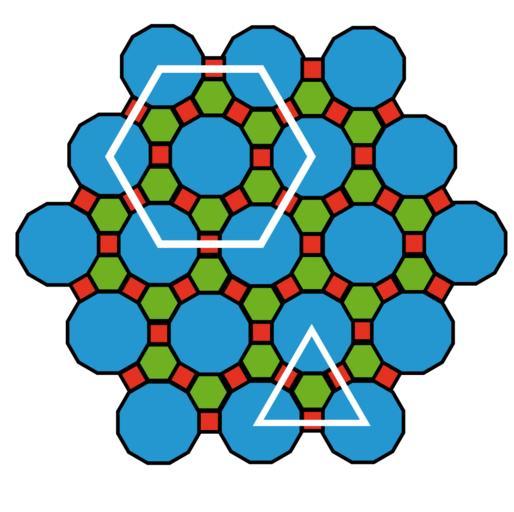 | Keywords: Fund un prim cell.svg en A fundamental unit triangle and a primitive cell hexagon in a truncated trihexagonal tiling The tiling can be generated from the triangle by using translations and rotations whereas it can be generated from the hexagon by using only translations own T Yamaguchi 2010-10-04 Aperiodic sets of tiles |