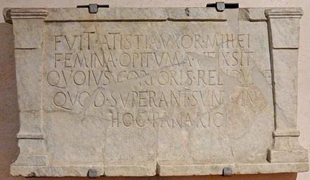 Keywords: Funeral stele Atistia Terme.jpg Funeral stele of Atistia Latin inscription Fuit Atistia uxor mihei/ femina opituma ueixsit/ quoius corporis reliquiæ/ quod sic superant sunt in/ hoc panario Atistia was my wife She lived as an excellent woman whose surviving remains are in this bread basket Found at the Porta Maggiore 1838 es Placa funeraria romana encontrad cerca de Porta Maggiore en Roma en 1838 correspondiente con CIL VI 1958b CIL I 1206 p 970 AE 1993 109 AE 2004 123 Fuit Atistia uxor mihei/ femina opituma veixsit/ quoius corporis reliquiae/ quod sic superant sunt in/ hoc panario Stèle funéraire Inscription latine « Fuit Atistia uxor mihei / femina opituma ueixsit / quoius corporis reliquiæ / quod superant sunt in / hoc panario » « Atistia était ma femme Elle a vécu la vie d'une excellente femme ce qui reste de son corps se trouve dans ce panier à pain » H 72 cm 28 ¼ in W 110 cm 43 ¼ in Museum Terme di Diocleziano Corpus inscriptionum latinarum 1 2 1206 object history credit line accession number Jastrow 2006 other versions Ancient Roman funerary steles in Rome Latin inscriptions in Rome Museo delle Terme Ancient Roman inscriptions in Rome Terme Ancient Roman gravestones in Rome Terme Ancient Roman inscriptions in the Museo delle Terme di Diocleziano Tomb of Eurysaces Rome 1838 Ancient Roman women Atistia CIL I² 001016 CIL VI 001958b AE 1993 0109 AE 2004 0123 |