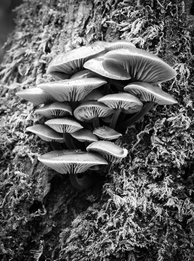 Keywords: fungi tree nature fungus mushroom forest trunk autumn fall bark wood natural flora plant growth moss dead white outdoor gray black and white