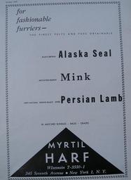 | Keywords: Fur wholesale dealer Myrtil Harf; New York, oct 1959 advertisment.jpg Myrtil Harf 345 Seventh Avenue New York 1 N Y for fashionable furriers - the finest pelts and furs obtainable black-brown Alaska Seal mutation-ranch mink grey-natural brown-black dyed Persian lamb in matched bundles - bales - grades Myrtil Harf WIsconsin 7-3550-1 345 Seventh Avenue New York 1 N Y American Furrier and Sol Vogel Oct 1959 page 31 Collection Kuhn 1959-06 Kürschner <span class signature-talk >talk</span> 13 15 27 August 2010 UTC de German Wikipedia 1 DEFAULTSORT Harf Myrtil Furriers in New York Harf Myrtil Fur wholesale dealers in New York Harf Myrtil American Furrier and Sol Vogel 1959-10 1959 advertisements Fur fashion in 1959 |