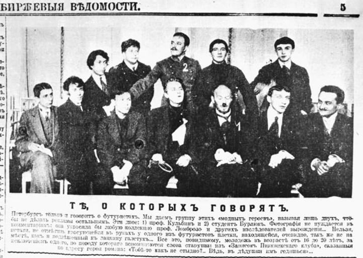 Keywords: Futuristy (Birzhevye vedomosti).jpg Футу исты http //www hlebnikov ru/biography/1913/14 htm before 1917 anonimous PD-RusEmpire ImageNote 1 162 92 59 75 704 500 2 Пасте нак ImageNoteEnd 1 ImageNote 2 407 156 60 86 704 500 2 Кульбин ImageNoteEnd 2 ImageNote 3 508 164 66 81 704 500 2 Лившиц ImageNoteEnd 3 ImageNote 4 116 143 62 75 704 500 2 андельштам ImageNoteEnd 4 ImageNote 5 52 157 58 70 704 500 2 Рю ик Ивнев ImageNoteEnd 5 ImageNote 6 318 59 53 73 704 500 2 иколай Бу люк ImageNoteEnd 6 ImageNote 7 310 152 67 69 704 500 2 Каменский ImageNoteEnd 7 Russian futurist poets Files uploaded by Shakko from various sources Burluk family |