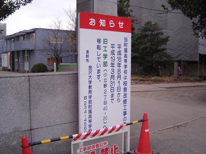| Keywords: Fuzoku-remodel-2.JPG This is the signboard which informs about construction (Kanazawa University High School・school building repair construction) 金沢大学附属高等学校・工事を知らせる (工事風景) Photographer <font color green>Genppy</font> talk Kanazawa University High School circumstances of the construction No 1 2006-11-23 own assumed Genppy Building repairs in Japan Tate-kanban Traffic cones in Japan Traffic cone bars Red and white diagonal stripes right | ||||