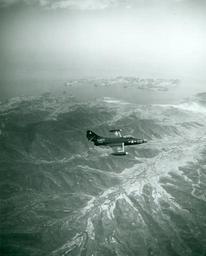 | Keywords: outdoor water ocean monochrome 80-G-429645.  Grumman F9F-2 "Panther" fighter (Bureau # 123649), of Fighter Squadron 721 (VF-721)  Flying escort for a photo plane, near Sinpo, North Korea. Pilot is Lt(JG) T.G. Nielson, USNR.  This aircraft is based aboard USS Boxer (CV-21).  Photo is dated 9 June 1951.  Note rugged terrain below.    Official U.S. Navy Photograph, now in the collections of the National Archives.  80-G-429645.  Grumman F9F-2 "Panther" fighter (Bureau # 123649), of Fighter Squadron 721 (VF-721)  Flying escort for a photo plane, near Sinpo, North Korea. Pilot is Lt(JG) T.G. Nielson, USNR.  This aircraft is based aboard USS Boxer (CV-21).  Photo is dated 9 June 1951.  Note rugged terrain below.    Official U.S. Navy Photograph, now in the collections of the National Archives.   |