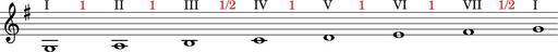 | Keywords: G major scale with degrees and tones.svg en G major scale with degrees and tones fr Gamme de sol majeur avec ses degrés et l'indication des tons 2014-03-01 11 11 56 own Romainbehar LilyPond source <pre> \version 2 16 2 \new Staff \with \remove Time_signature_engraver \set Score defaultBarType empty \clef treble \key g \major g1 \markup I \once \override NoteHead 'transparent t c \markup \with-color red 1 a1 \markup II \once \override NoteHead 'transparent t c \markup \with-color red 1 b1 \markup III \once \override NoteHead 'transparent t c \markup \with-color red 1/2 c'1 \markup IV \once \override NoteHead 'transparent t c \markup \with-color red 1 d'1 \markup V \once \override NoteHead 'transparent t c \markup \with-color red 1 e'1 \markup VI \once \override NoteHead 'transparent t c \markup \with-color red 1 fis'1 \markup VII \once \override NoteHead 'transparent t c \markup \with-color red 1/2 g'1 \markup I </pre> cc-zero Uploaded with UploadWizard Musical scales GNU LilyPond images |