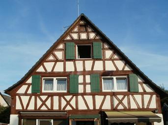 Keywords: gable pediment timber framing altlussheim windows shutters architecture building old style house classic roof exterior facade historic structure construction handicraft