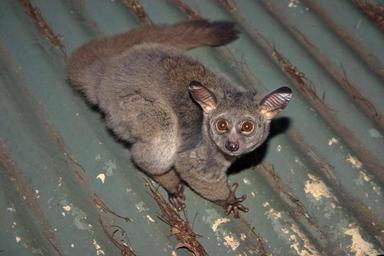 Keywords: galago bush baby nocturnal big eyes large ears bushy tail corrugated metal roof swaziland africa