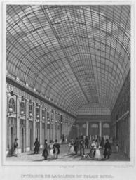 Keywords: Galerie of the Palais Royal - interior, 1831.jpg The popularity of the Galeries of the Palais Royal dates back to the late eighteenth century when Parisians visited the arcades at all hours in search of entertainment Remaining open until 2 in the morning the Galeries featured circus-like attractions in addition to 180 boutiques In an attempt to rid the garden of prostitutes and criminals Louis-Philippe orchestrated the closing of a portion of the arcades in 1828 and opened the Galerie d'Orléans in 1830 shown here Its cover consisted of a glass roof and it was said to be the most architecturally spectacular of all of the arcades at the time The structure's impressive combination of iron and glass of classical yet advanced styles is testimony to its architectural depth and complexity that influenced the construction of other arcades in Europe However due to its relatively poor location and competition with other arcades the Galerie d'Orléans was one of the least successful arcades of the nineteenth century It was partially demolished in 1935 in an attempt to restore life to the Palais-Royal leaving an open courtyard in the first arrondissement 1831 engraving Institution Brown University Library object history exhibition history credit line accession number 1093265695229500 PD-old Engravings of buildings in Paris Images of Paris from the Brown University Library 1831 in Paris 1831 engravings Historical images of Palais Royal