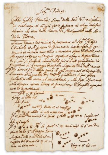 Keywords: Galileo manuscript.png of a telescope which had been developed the year before in the Dutch town of Middelburg by an optician one Jan Lippershey Applying his knowledge of optical science Galileo built such a glass or telescope for himself and in the draft letter shown above offers his new occhiale to the Doge of Venice for use in warfare The final letter revised from this draft was sent on August 24 1609 It is in the State Archives in Venice The lower part of this sheet shows the use to which Galileo put this optical device as he viewed the skies on successive evenings in January 1610 he noted his first observations of the planet Jupiter and four of Jupiter's moons This item is cataloged in the collections as Galileo Galilei 1564-1642 Draft of a letter to Leonardo Donato Doge of Venice Circa August 1609 Gift of Tracy W McGregor 1938 According to Scientific American when it was donated it was known to be a draft of the letter in the Venice State Archives but the significance and meaning of the material on the lower half was unrecognized Only in the late 1970s was it determined that these doodles in fact depict the positions of the Galilean moons on the nights in early January when Galileo first observed them thus proving that this document contains the original notes he took on the nights he made his observations See Scientific American article Date late 70s or early 80s The University of Michigan translates the upper half thus Most Serene Prince Galileo Galilei most humbly prostrates himself before Your Highness watching carefully and with all spirit of willingness not only to satisfy what concerns the reading of mathematics in the study of Padua but to write of having decided to present to Your Highness a telescope that will be a great help in maritime and land enterprises I assure you I shall keep this new invention a great secret and show it only to Your Highness The telescope was made for the most accurate study of distances This telescope has the advantage of discovering the ships of the enemy two hours before they can be seen with the natural vision and to distinguish the number and quality of the ships and to judge their strength and be ready to chase them to fight them or to flee from them; or in the open country to see all details and to distinguish every movement and preparation cs Galileův objev měsíců Jupiteru Toto je stránka z Galileem publikovaného objevu měsíců která se objevila v Sidereus Nuncius v březnu 1610 Jedním z nejvýznamnějších Galileiho vědeckých přínosů byl objev čtyř satelitů Jupiteru které jsou nyní pojmenovány na jeho počest Galileo poprvé pozoroval Jupiterovi měsíce 7 ledna 1610 podomácky vyrobeným dalekohledem Nejdřív si myslel že vidí poblíž Jupiteru tři hvězdy roztažené na přímce procházející planetou Příští večer se zdálo že se hvězdy pohybují špatným směrem což přitáhlo jeho pozornost Galileo pokračoval v pozorování hvězd a Jupiteru další týden 11 ledna se objevila čtvrtá hvězda která je nyní známa jako Ganymedes Po týdnu Galileo pozoroval že tyto čtyři hvězdy se nikdy nevzdálí z blízkosti Jupiteru jako by byly k planetě připoutány pouze mění navzájem své pozice spolu s Jupiterem Nakonec se Galileo odhodlal k závěru že tyto objekty nejsou hvězdami ale planetárními tělesy která krouží kolem Jupiteru Tento objev přinesl důkaz podporující Koperníkův systém a ukázal že vše nekrouží kolem Země PŘEKLAD Měl bych odhalit a zvěřejnit světu událost objevení a pozorování čtyř planet dosud nikdy neviděných od počátku světa až do našich časů jejich pozice a pozorování jejich pohybů a změn magnitudy které jsem prováděl během posledních dvou měsíců; a vyzývám všechny astronomy aby osobně vyzkoušeli a určili jejich periody čehož se mi až do dnešního dne nepodařilo dosáhnout Sedmého lednového dne tohoto roku 1610 v první hodině následující noci jsem pozoroval postavení hvězd na nebesích pomocí dalekohledu a můj pohled upoutala planeta Jupiter a protože jsem si vyrobil velmi dobrý přístroj povšiml jsem si podrobností kterých jsem si nemohl povšimnout dříve jmenovitě tří drobných hvězd malých ale jasných které byly poblíž planety; a ačkoliv jsem věřil že patří k velkému množství stálých hvězd přesto mě upoutaly neboť byly uspořádány přesně v jedné linii paralelně k ekliptice a byly jasnější než jiné hvězdy o stejné magnitudě Když jsem se 8 ledna veden osudem vrátil zpět a podíval se opět na stejné místo oblohy shledal jsem velmi odlišné uspořádání věcí kde se tyto tři hvězdičky nacházely všechny západně od Jupiteru a byly si blíže než předcházející noci Z toho jsem učinil závěr a to bez zaváhání že se tyto tři hvězdy na obloze pohybují kolem Jupiteru stejně jako se Venuše a Merkur pohybují kolem Slunce; což se nakonec po mnoha následných pozorováních ukázalo jasným jako denní svit Tato pozorování navíc ukázala že nebyly tři ale čtyři bloudivá hvězdná tělesa vykonávající své kroužení kolem Jupiteru Galileo observou as lúas de Xúpiter o 7 de xaneiro de 1610 a través dun telescopio caseiro Orixinalmente pensou estar vendo tres estrelas preto de Xúpiter formando unha liña co planeta A noite seguinte as estrelas pareceran moverse un pouco o que chamou a súa atención e continou observando as estrelas e Xúpiter a seguinte semana O 11 de xaneiro viu aparecer unha cuarta estrela que despois sería coñecida como Ganímedes Tras unha semana Galileo observou que as estrelas permanecían nas proximidades de Xúpiter sendo transportadas co planeta e que cambiaban a súa posición relativa e en relación a Xúpiter Finalmente Galileo determinou que non estaba observando estrelas senón corpos que estaban en órbita arredor de Xúpiter Este descubrimento subministrou a evidencia que ap