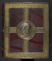 Keywords: Gallican Psalter with canticles (the 'Lothar Psalter' or 'Lothaire Psalter') - Upper Cover (Add ms 37768).jpg Style Treasure binding Religious miscellaneous Pictorial; Caption Upper Cover; Colour Red; Edge Unspecified exhibition history Decorative Technique Onlaid; Cover Material Metal Silk Leather unspecified Silve Origin Germany Aachen or Northern France Tours Provenance The court of the Emperor Lothar at Aachen probably made for a sister of the Emperor Binding has been added to Wooden boards covered on the outside with brown leather and over that with dark red silk with 4 strips of parchment from a 13th century manuscript inside the front and back covers Silver corner-guards and silver clasps on red velvet bands A large silver-gilt medallion showing a bearded and moustached head in profile wearing a crown or helmet similar to heads of the seals of Louis and Lothar perhaps of the 9th century has been attached to the upper outside cover; this is enclosed in a framework of silver-gilt with a flat conventional leaf-pattern probably of a later date 10th or 11th century The outside lower cover has been slightly hollowed for a 12th-century ivory figure of King David seated with a harp This figure has been removed and is now stored separately object history Text 9c; Germany/France ; Unspecified object type Cc-zero place of creation Binding Germany place of discovery Unspecified British Library image http //www bl uk/catalogues/bookbindings/LargeImage aspx RecordId 020-000018500 ImageId ImageId 57130 Copyright BL Gallican Psalter with canticles the 'Lothar Psalter' or 'Lothaire Psalter' Uploaded with GWToolset Gallican Psalter with canticles the 'Lothar Psalter' or 'Lothaire Psalter' - Upper Cover Add ms 37768 http //www webarchive org uk/bldatasets/bindings/add_ms_37768_fblefr jpg Bookbinding 13th-century bookbinding British Library Bookbindings |