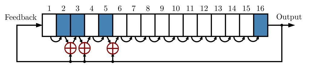 Keywords: Galois LFSR.svg A Galois-configuration Linear Feedback Shift Register LFSR The taps are 16 5 3 2 0 The chacteristic polynomial is therefore <math>x 16 + x 5 + x 3 + x 2 + 1\ </math> This generates the same sequence as this Fibonnacci-configuration LFSR taps 16 14 13 11 0 self-made Inkscape 01/10/2007 Inductiveload Cryptography diagrams |