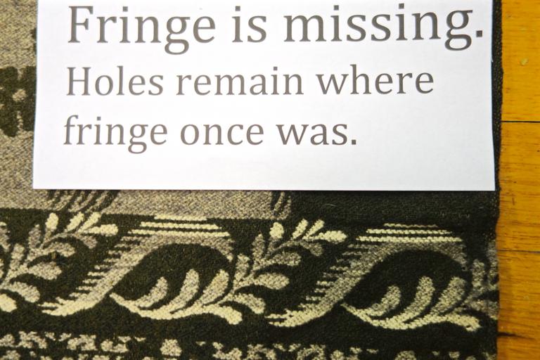 | Keywords: Galway Shawl Close Up.jpg en Close up of the vintage Galway Shawl showing the weave and holes in fabric where fringe was removed 2016-12-14 19 39 23 own LynnMGallagher other versions cc-zero Clothing of Ireland Shawls Galway Paisley Weaving Galway Shawl |