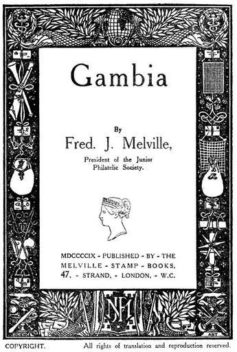 Keywords: Gambia title page Fred Melville.jpg en Title page from book published in 1909 Author died 1940 http //www templarphilatelics co uk/index php cat Free_Philatelic_eBooks Melville Stamp Books 1909 PD-old Philatelic literature Post of Gambia Fred Melville |