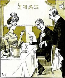 Keywords: GammelVane.jpg en Old habit <br> - Listen waiter a bottle of Liebfraumilch Our Lady's milk a type of wine 40 danish kroner about one month's salary - it is expensive <br> - Sorry but the lady always drinks the same when she dines here and none of the gentlemen have ever complained about the price da Gammel Vane <br>- Hør Kellner en flaske liebfraumilch 40 kroner - den er noget hvas <br>- Undskyld men den Dame drikker altid den slags når hun souperer her og der er aldrig nogen af Herrerne der har klaget over prisen Ravnen side 44 Th J 1901-02-10 PD DEFAULTSORT Ravnen PD-Art Ravnen 1901 cartoons Caricatures of couples Courtesans 1901 in Denmark People in 1901 Images by Haabet Cafés in art Cafés in Denmark Fashion in 1901 Smoking men in art Waiters in art Bottles in art |