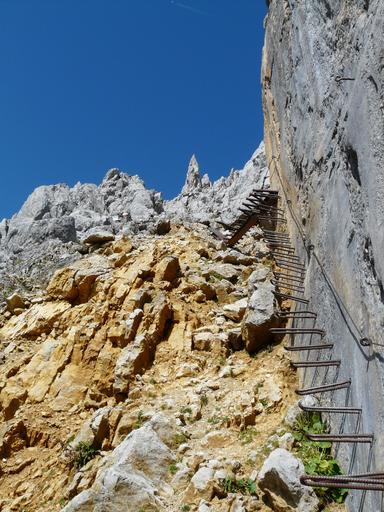 | Keywords: gamsängersteig climbing shoring metal head iron pins iron brackets clamp iron hook pens climbing aid ellmauer halt red rinn gathered hunter wall aid mountains alpine wilderkaiser kaiser mountains medium difficulty exposed climber the rope rock steep |