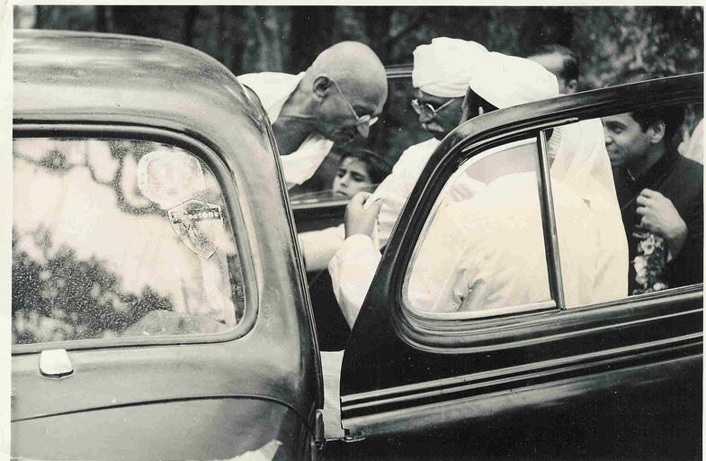 Keywords: Gandhiji’s arrival in Simla, Gandhiji alighting from the car outside Manorvilla, Simla, in 1945. Source: UH Manoa Library