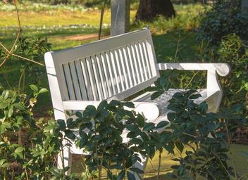 Keywords: garden bench bank park bench garden rest recovery forest seat sit out trees shadow resting place idyllic park