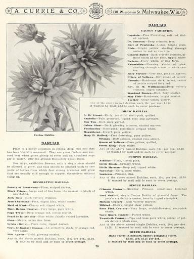 | Keywords: Garden and farm seeds (15817970853).jpg ÂŁ L <br> A CURRIE COlg jgff M 130 Wisconsin stMilwaukee Wis <br> Cactus Dahlia <br> DAHLIAS <br> Plant in a sunny situation in strong deep rich soil that <br> has been liberally manured They are gross feeders and suc- <br> ceed best when given plenty of room and an abundant sup- <br> ply of water Stir the ground frequently about them <br> For large exhibition flowers only a single stem should <br> be allowed to grow and that should be pinched back to two <br> pairs of leaves from which four strong branches will grow <br> that are usually stiff enough to support themselves without <br> tying up L J _ il J <br> DECORATIVE DAHLIAS <br> Beauty of Brentwood Plum striped darker <br> Black Prince Large and of fine form the nearest to black of <br> any dahlia <br> Jack Hose Rich velvety crimson <br> Jean Charmant Pink edged lilac white center <br> Maid of Kent Cherry red tipped white <br> Mine Helene Charvet Very large pure white <br> Papa Tryve Deep orange-red tinted scarlet <br> Pearl de la tete d'or Fine white faintly veined lavender <br> Oban Mauve extra fine form <br> Sylvia Dolly Flesh color tipped darker <br> Souv de Gustavc Douzon An attractive shade of orange-red <br> very large <br> Wm Agnew Vivid glowing scarlet <br> Any of the above named Dahlias each 15c; per doz 1 50 <br> If wanted by mail add 5c each to cover postage <br> DAHLIAS <br> CACTUS VARIETIES <br> Capstain Free Flowering soft red tint- <br> ed apricot <br> Dr Jameson Deep crimson free <br> Earl of Pembroke Large bright plum <br> Elsie Bright yellow shading through <br> amber to red at the tips <br> General Buller Rich velvety crimson al- <br> most black at the base tipped white <br> Iceberg Ivory white of fine form <br> Kriemhilda Pleasing shade of pink <br> shading through cream to white cen- <br> ter <br> Mary Service Very fine pinkish apricot <br> Prince of Yellows Soft shade of yellow <br> Phoenix Handsome dark velvet center <br> of petals striped fiery red <br> Rev D M Williamson Deep velvety <br> crimson edged carmine <br> Standard Bearer Rich fiery scarlet <br> Star Fish Handsome bright scarlet <br> Voelker Clear -lemon yellow <br> Any of the above named dahlias each 15c; per doz 1 50 <br> If wanted by mail add 5c each to cover postage <br> SHOW DAHLIAS <br> A D Livoni Early beautiful shell-pink quilled <br> Arabella Pale primrose tipped rose and lavender <br> Bon Ton Rich deep garnet <br> Cuban Giant Dark glowing crimson shaded maroon <br> Fascination Rose-pink sometimes striped white <br> Magnificent Dwarf pure yellow <br> Mary D Hallock Free flowering pure yellow <br> Orlando Buff salmon shaded rose-amber <br> Queen of Yellows Pure yellow quilled <br> Storm King Pure white <br> Any of the above named Dahlias each 15c; per doz 1 50 <br> If wanted by mail add 5c each to cover postage <br> POMPOIV DAHLIAS <br> Achilles Flesh tinted pink <br> Little Bessie Creamy white <br> Little Herman Deep red tipped white <br> Snowclad Early pure white <br> Sunbeam Crimson fine <br> Any of the above named Dahlias each 15c; per doz <br> If wanted by mail add 5c each to cover postage <br> 1 50 <br> SINGLE DAHLIAS <br> Crimson Century Glowing Crimson sometimes blotched <br> white <br> Lord Goff A single Cactus Dahlia of graceful form The <br> petals are delicate cream heavily tipped rose-pink <br> Maroon Century Rich velvety maroon <br> Mildred Showy bright clear yellow <br> Rose Pink Century Very large orchid-flowered rosy-pink <br> shade <br> Snow Queen Century Purest white <br> Twentieth Century Tips and base pure white center of pet- <br> als del' cate blush rose <br> Any of the above named single Dahlias each 20c; per doz <br> 1 75 If wanted by mail add 5c each to cover postage <br> MIXED DAHLIAS <br> Many colors in mixture cannot designate colors <br> Each 15c; 1 25 per doz <br> If wanted by mail add 5c each to cover postage 42156436 132760 65915 Page 72 Text http //www biodiversitylibrary org/page/42156436 1913 10 5962/bhl title 65915 A Currie Company ; Henry G Gilbert Nursery and Seed Trade Catalog Collection NameFound Arabella NameConfirmed Arabella EOLID 52830 NameBankID 2551431 NameFound Sylvia NameConfirmed Sylvia EOLID 104750 NameBankID 2472976 Biodiversity Heritage Library Garden and farm seeds spring 1913 um Garden Stories Bulbs Plants Catalogs Equipment and supplies Flowers Gardening Nurseries Horticulture Plants Ornamental Seeds Vegetables U S Department of Agriculture National Agricultural Library bhl page 42156436 dc identifier http //biodiversitylibrary org/page/42156436 bhlGardenStories Dahlias A Currie Co BHLinbloom bulbs plants nurseries horticulture plants ornamental u s department of agriculture national agricultural library bhlgardenstories a currie co bhlinbloom Information field Flickr posted date ISOdate 2015-02-03 Check categories 2015 August 25 CC-BY-2 0 BioDivLibrary https //flickr com/photos/61021753 N02/15817970853 2015-08-25 01 50 44 cc-by-2 0 PD-old-70-1923 Garden and farm seeds 1913 Photos uploaded from Flickr by FĂŚ using a script |