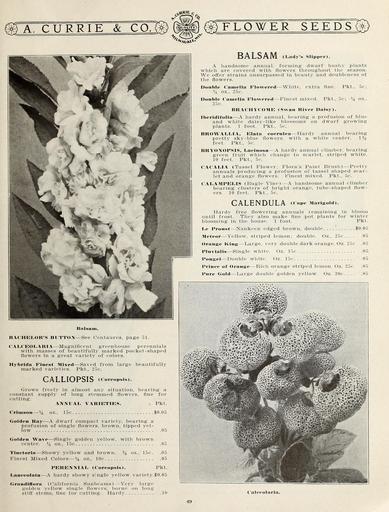 | Keywords: Garden and farm seeds (16346743906).jpg dSSEJJL <br> A CURRIE Ca <br> FLOWER SEEDSi <br> Balsam <br> BACHELOR'S BUTTON See Centaurea page 51 <br> CALCEOLARIA Magnificent greenhouse perennials <br> with masses of beautifully marked pocket-shaped <br> flowers in a great variety of colors <br> Hybrlda Finest Mixed Saved from large beautifully <br> marked varieties Pkt 25c <br> CALLIOPSIS Coreopsis <br> Grows freely in almost any situation bearing a <br> constant supply of long stemmed flowers fine for <br> cutting <br> ANNUAL VARIETIES Pkt <br> Crimson Vi oz 15c 0 05 <br> Golden Ruy A dwarf compact variety bearing a <br> profusion of single flowers brown tipped yel- <br> low 05 <br> Golden Wave Single golden yellow with brown <br> center oz 15e 05 <br> Tinctoria Showy yellow and brown oz 15c 05 <br> Finest Mixed Colors oz 10c 05 <br> PERENNIAL Coreopsis Pkt <br> Lnneeolnta A hardy showy single yellow variety 0 05 <br> Grnndiflorn California Sunbeams Very large <br> golden yellow single lowers borne on long <br> stiff stems fine for cutting Hardy 10 <br> BALSAM Lady's Slipper <br> A handsome annual forming dwarf bushy plants <br> which are covered with flowers throughout the season <br> We offer strains unsurpassed in beauty and doubleness of <br> the flowers <br> Double Cornelia Flowered White extra fine Pkt 5c; <br> Vi oz 25c <br> Double Caineliti Flowered Finest mixed Pkt 5c; oz <br> 25c <br> BRACHYCOME Swan River Daisy <br> Ibcridit'olia A hardy annual bearing a profusion of blue <br> and white daisy-like blossoms on dwarf growing <br> plants 1 foot Pkt 5c <br> BROWALLIA Elata eoerulea Hardy annual bearing <br> pretty sky-blue flowers with a white center 1 <br> feet Pkt 5c <br> BRYONOPSIS Laciiiosa A hardy annual climber bearing <br> green fruit which change to scarlet striped white <br> 10 feet Pkt 5c <br> CACALIA Tassel Flower; Flora's Paint Brush Pretty <br> annuals producing a profusion of tassel shaped scar- <br> let and orange flowers Finest mixed Pkt 5c <br> CALAMPELIS Bugle Vine A handsome annual climber <br> bearing clusters of bright orange tube-shaped flow- <br> ers 10 feet Pkt 5c <br> CALENDULA Cape Marigold <br> Hardy free flowering annuals remaining in bloom <br> until frost They also make fine pot plants for winter <br> blooming in the house 1 foot Pkt <br> Le Proust Nankeen edged brown double 0 05 <br> Meteor Yellow striped lemon; double Oz 25c 05 <br> Orange King Large very double dark orange Oz 25c 05 <br> Pluvialis Single white Oz 15c 05 <br> Pongei Double white Oz 15c 05 <br> Prince of Orange Rich orange striped lemon Oz 25c 05 <br> Pure Gold Large double golden yellow Oz 30c 05 <br> Calceolaria <br> IS 42156501 132761 65916 Page 49 Text http //www biodiversitylibrary org/page/42156501 1912 10 5962/bhl title 65916 A Currie Company ; Henry G Gilbert Nursery and Seed Trade Catalog Collection NameFound Brachycome NameConfirmed Brachycome EOLID 6264712 NameBankID 3443227 NameFound Browallia NameConfirmed Browallia L EOLID 60719 NameFound Bryonopsis NameConfirmed Bryonopsis NameBankID 3450624 NameFound Cacalia NameConfirmed Cacalia L EOLID 2525723 NameBankID 471173 NameFound Calampelis NameConfirmed Calampelis D Don EOLID 23521349 NameBankID 1792288 NameFound Calceolaria NameConfirmed Calceolaria EOLID 72303 NameBankID 2665046 NameFound Calendula NameConfirmed Calendula EOLID 59414 NameBankID 25725 NameFound Calliopsis NameConfirmed Calliopsis EOLID 2748143 NameBankID 4099619 NameFound Centaurea NameConfirmed Centaurea L EOLID 59386 NameFound Coreopsis NameConfirmed Coreopsis L EOLID 38349 NameFound Cornelia NameConfirmed Cornelia EOLID 13316968 NameBankID 3466941 NameFound Elata eoerulea NameFound Laciiiosa NameFound Pluvialis NameConfirmed Pluvialis EOLID 19929 NameBankID 2473350 Biodiversity Heritage Library Garden and farm seeds spring 1912 Garden Stories Bulbs Plants Catalogs Equipment and supplies Flowers Gardening Nurseries Horticulture Plants Ornamental Seeds Vegetables U S Department of Agriculture National Agricultural Library bhl page 42156501 dc identifier http //biodiversitylibrary org/page/42156501 bhlGardenStories BHLinbloom bulbs plants nurseries horticulture plants ornamental u s department of agriculture national agricultural library bhlgardenstories bhlinbloom Information field Flickr posted date ISOdate 2015-01-26 Check categories 2015 August 25 CC-BY-2 0 BioDivLibrary https //flickr com/photos/61021753 N02/16346743906 2015-08-25 06 51 38 cc-by-2 0 PD-old-70-1923 Garden and farm seeds 1912 Photos uploaded from Flickr by FĂŚ using a script |