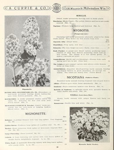 | Keywords: Garden and farm seeds (16346767346).jpg A CURRIE CO m Qjm <br> 1 130 Wisconsin St Milwaukee Wis £» <br> - TT ' <br> 1 'W ' <br> Mignonette <br> MATRICARIA GRANDIPLORA FL PL Feverfew ” A <br> half-hardy perennial bearing double button-like <br> pure white flowers profusely Pkt 5c <br> MAURANDIA ” A tender perennial climber useful for <br> vases etc flowering the first year from seed <br> Finest mixed Pkt 5c <br> MESEMBRYANTHEMUM Tricolor ” Dwarf tender per- <br> ennial fine for rock-work or hanging baskets <br> Mixed colors Pkt 5c <br> MIGNONETTE <br> MIMULUS <br> Dwarf tender perennials thriving well in shady places <br> Moschatus Musk Plant ” The yellow flowers and leaves are musk- <br> scented Pkt 5c <br> Tigrinus ” Flowers large/spotted and blotched Pkt 5c <br> MYOSOTIS <br> ' Forget-me-not <br> Charming half-hardy perennials admirably adapted for damp <br> shady places They flower the first season from seed <br> Pkt <br> Alpestris Alba ” Dwarf white 0 05 <br> Dissitiflora ” Very early rich blue 10 <br> Palustris The true forget-me-not ” Early clear blue 05 <br> Ruth Fischer ” A grand new dwarf variety producing large <br> clusters of clear blue flowers measuring about half an <br> inch across The foliage is a rich glossy green It <br> makes a splendid pot plant 15 <br> Semperflorens Quick and everblooming ” Blooms from early <br> spring until late in fall Clear blue 10 <br> The Sylph ” A new compact variety with silvery-white flowers <br> borne on long stems 10 <br> NEMOPHIIjIA ” Beautiful dwarf-growing hardy annuals bearing <br> cup-shaped flowers in great abundance all through the <br> season The colors are mostly blue Choice Mixed 05 <br> NICOTIANA Tobacco Plant <br> Beautiful hardy annuals bearing fragrant tube-shaped flowers <br> Aflinis ” Flowers pure white borne abundantly Pkt 5c <br> Sanderae ” Bears numerous carmine-rose flowers Pkt 5c <br> Hybrids of Sanderae ” A splendid strain with splendid flowers in <br> many shades and colors Pkt 10c <br> NIGELA Love-in-a-Mist <br> Showy hardy annuals with unique flowers and finely cut <br> foliage <br> Dainascena ” Double blue and white Pkt 5c <br> Pkt <br> Defiance ” A profuse bloomer with very long spikes Very fragrant <br> Oz ž 50c 50 10 <br> Golden Queen ” Produces large spikes of a golden color Oz 40c <br> Machet ” Bears numerous thick spikes of deliciously fragrant flow- <br> ers Oz 60c <br> Large Flowering ” Sweet scented Oz 15c <br> Goliath ” A large flowering red variety with very heavy spikes of <br> do <br> uble florets delightfully fragrant Vi oz 50c <br> White Pearl ” A mammoth flowering variety with long heavy spikes <br> color pearly white Vi oz 50c <br> 60 <br> 05 <br> 05 <br> 05 <br> 10 <br> 10 <br> Myosotis Ruth Fischer 42156512 132761 65916 Page 60 Text http //www biodiversitylibrary org/page/42156512 1912 10 5962/bhl title 65916 A Currie Company ; Henry G Gilbert Nursery and Seed Trade Catalog Collection NameFound Alpestris NameConfirmed Alpestris NameBankID 5330161 NameFound Dissitiflora NameFound MATRICARIA NameConfirmed Matricaria EOLID 61738 NameBankID 2659011 NameFound Maurandia NameConfirmed Maurandia NameBankID 8674346 NameFound Mesembryanthemum NameConfirmed Mesembryanthemum EOLID 11256701 NameBankID 2665273 NameFound Mimulus NameConfirmed Mimulus EOLID 103579 NameBankID 4774934 NameFound Moschatus NameConfirmed Moschatus NameBankID 4248171 NameFound MYOSOTIS NameConfirmed Myosotis EOLID 40769 NameBankID 2654540 NameFound Nicotiana NameConfirmed Nicotiana EOLID 11196275 NameBankID 2653638 NameFound Palustris NameConfirmed Palustris Hust J W G Lund NameBankID 5332955 NameFound Tigrinus Biodiversity Heritage Library Garden and farm seeds spring 1912 Garden Stories Bulbs Plants Catalogs Equipment and supplies Flowers Gardening Nurseries Horticulture Plants Ornamental Seeds Vegetables U S Department of Agriculture National Agricultural Library bhl page 42156512 dc identifier http //biodiversitylibrary org/page/42156512 bhlGardenStories BHLinbloom bulbs plants nurseries horticulture plants ornamental u s department of agriculture national agricultural library bhlgardenstories bhlinbloom Information field Flickr posted date ISOdate 2015-01-26 Check categories 2015 August 25 CC-BY-2 0 BioDivLibrary https //flickr com/photos/61021753 N02/16346767346 2015-08-25 06 51 57 cc-by-2 0 PD-old-70-1923 Garden and farm seeds 1912 Photos uploaded from Flickr by Fæ using a script |