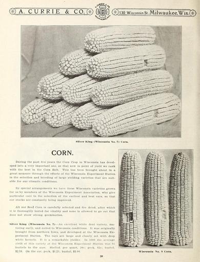 | Keywords: Garden and farm seeds (16370957771).jpg £ <br> A CURRIE CO » <br> 130 Wisconsin st Milwaukee Wis <br> lver King Wisconsin No 7 Corn <br> CORN <br> During the past five years the Corn Crop in Wisconsin has devel- <br> oped into a very important one so that now in point of yield we rank <br> with the best in the Corn Belt This has been brought about in a <br> great measure through the efforts of the Wisconsin Experiment Station <br> in the selection and breeding of large yielding varieties that are suit- <br> able for our climatic conditions <br> By special arrangements we have these Wisconsin varieties grown <br> for us by members of the Wisconsin Experiment Association who give <br> particular care to the selection of the earliest and best ears so that <br> our stocks are constantly being improved <br> All our Seed Corn is carefully selected and fire dried after which <br> it is thoroughly tested for vitality and none is allowed to go out that <br> does not show strong germination <br> Silver King Wisconsin No 7 ” An excellent white dent variety ma- <br> turing early and suited to Wisconsin conditions It was originally <br> brought from northern Iowa and developed at the Wisconsin Ex- <br> periment Station The ears are large and closely set with deep <br> white kernels It is a remarkable yielder In 1908 the average <br> yield of this variety at the Wisconsin Experiment Station was 93 <br> bushels to the acre Shelled per quart 20c; peck S5c; bushel <br> 12 50 On the ear peck 1 25; bushel 3 00 <br> 30 <br> Wisconsin No S Corn 42156482 132761 65916 Page 30 Text http //www biodiversitylibrary org/page/42156482 1912 10 5962/bhl title 65916 A Currie Company ; Henry G Gilbert Nursery and Seed Trade Catalog Collection Biodiversity Heritage Library Garden and farm seeds spring 1912 Garden Stories Bulbs Plants Catalogs Equipment and supplies Flowers Gardening Nurseries Horticulture Plants Ornamental Seeds Vegetables U S Department of Agriculture National Agricultural Library bhl page 42156482 dc identifier http //biodiversitylibrary org/page/42156482 bhlGardenStories BHLinbloom bulbs plants nurseries horticulture plants ornamental u s department of agriculture national agricultural library bhlgardenstories bhlinbloom Information field Flickr posted date ISOdate 2015-01-26 Check categories 2015 August 25 CC-BY-2 0 BioDivLibrary https //flickr com/photos/61021753 N02/16370957771 2015-08-25 06 51 42 cc-by-2 0 PD-old-70-1923 Garden and farm seeds 1912 Photos uploaded from Flickr by Fæ using a script |