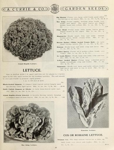 Keywords: Garden and farm seeds (16372661035).jpg A CURRIE CO j <br> GARDEN SEEDS <br> Grand Rapids Lettuce <br> LETTUCE <br> Lb <br> Big Boston Forms very large solid heads good either <br> for forcing or out-doors Pkt 5c; oz 10c; 'A lb 25c 85 <br> May King Grows rapidly forming large heads very <br> tender and sweet The outer leaves are tinged <br> brown heart rich yellow Pkt 5c; oz 10c; lb <br> 30c 1-00 <br> Prize Head Forms large loose heads leaves green <br> tinged brown at the edges Pkt 5c; oz 10c; Vt <br> lb 25c 85 <br> Mignonette Heads small firm and solid Outside <br> bronze-green inside creamy-white Pkt 5c; oz <br> 10c; lb 25c s ' <br> Boston Market White Seeded Tennis Hall An early <br> small forcing variety Pkt 5c; oz 10c; lb 25c 85 <br> Hanson Heads large and solid crisp and sweet Pkt <br> 5c; oz 10c; lb 25c 85 <br> Golden Queen Forms sold golden-yellow beads very <br> tender Pkt 5c; oz 10c; lb 25c S5 <br> St Louis Butter Heads large and solid crisp and ten- <br> der Pkt 5c; oz 10c; Vi lb 25c 85 <br> Yellow Seeded Butter Forms large yellowish-green <br> heads exceedingly crisp and tender Pkt 5c; oz <br> 10c; lb 30c 10c <br> Immensity Heads very large and solid always tender <br> and sweet and slow to run to seed Pkt 5c; oz <br> 10c; lb 25c ˘ ˘ ˘ - 8f <br> Sow in shallow drills 1 ft apart and thin out the plants to 4 inches <br> apart in the row and 8 inches for the heading varieties The soil should <br> be rich and friable to promote rapid growth <br> 1 oz to 300 feet of drill <br> Lb <br> Black-Seeded Simpson A compact loose-leaved variety largely used <br> for forcing Color light green Pkt 5c; oz 10c; lb 30c 1 00 <br> Early Curled Simpson or Silesia A curly loose-leaved early vari- <br> ety Pkt 5c; oz 10c; lb 25c 85 <br> Grand Kapids Extra Seleeted A favorite forcing variety forming <br> a compact mass of loose leaves Pkt 5c; oz 10c; lb 30c 1 00 <br> Koiusiiiic Lettuce <br> COS OR ROMAINE LETTUCE <br> Lb <br> May King Lettuce <br> Trianon Cos The long narrow leaves for a close up- <br> right head very sweet and tender Pkt 5c; oz <br> 10c; '/ lb 35c f°- 85 <br> 15 42156467 132761 65916 Page 15 Text http //www biodiversitylibrary org/page/42156467 1912 10 5962/bhl title 65916 A Currie Company ; Henry G Gilbert Nursery and Seed Trade Catalog Collection Biodiversity Heritage Library Garden and farm seeds spring 1912 Garden Stories Bulbs Plants Catalogs Equipment and supplies Flowers Gardening Nurseries Horticulture Plants Ornamental Seeds Vegetables U S Department of Agriculture National Agricultural Library bhl page 42156467 dc identifier http //biodiversitylibrary org/page/42156467 bhlGardenStories BHLinbloom bulbs plants nurseries horticulture plants ornamental u s department of agriculture national agricultural library bhlgardenstories bhlinbloom Information field Flickr posted date ISOdate 2015-01-26 Check categories 2015 August 25 CC-BY-2 0 BioDivLibrary https //flickr com/photos/61021753 N02/16372661035 2015-08-25 06 52 01 cc-by-2 0 PD-old-70-1923 Garden and farm seeds 1912 Photos uploaded from Flickr by FĂŚ using a script |