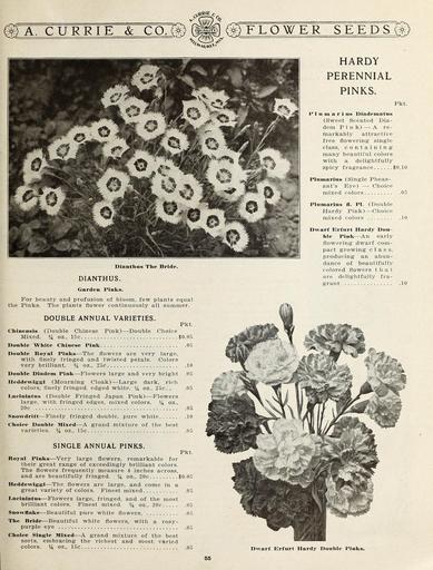 Keywords: Garden and farm seeds (16372731535).jpg A CURRIE COJ <br> £» <br> FLOWER SEEDS <br> Dianthus The Bride <br> DIANTHUS <br> Garden Pinks <br> For beauty and profusion of bloom few plants equal <br> the Pinks The plants flower continuously all summer <br> DOUBLE ANNUAL VARIETIES <br> Pkt <br> Cbinensis Double Chinese Pink ” Double Choice <br> Mixed Vi oz 15c 0 05 <br> Double White Chinese Pink 05 <br> Double Royal Pinks ” The flowers are very large <br> with finely fringed and twisted petals Colors <br> very brilliant oz 25c 10 <br> Double Diadem Pink ” Flowers large and very bright 05 <br> Heddewiggi Mourning Cloak ” L arge dark rich <br> colors finely fringed edged white oz 25c 05 <br> T aciniatus Double Fringed Japan Pink ” Flowers <br> large with fringed edges mixed colors oz <br> 20c 05 <br> Snowdrift ” Finely fringed double pure white 10 <br> Choice Double Mixed ” A grand mixture of the best <br> varieties oz 15c 05 <br> SINGLE ANNUAL PINKS <br> Pkt <br> Royal Pinks ” Very large flowers remarkable for <br> their great range of exceedingly brilliant colors <br> The flowers frequently measure 4 inches across <br> and are beautifully fringed oz 20c 0 05 <br> Heddewiggi ” The flowers are large and come in a <br> great variety of colors Finest mixed 05 <br> I aciniatus ” Flowers large fringed and of the most <br> brilliant colors Finest mixed oz 20c 05 <br> Snowflake ” Beautiful pure white flowers 05 <br> The Bride ” Beautiful white flowers with a rosy- <br> purple eye - 05 <br> Choice Single Mixed ” A grand mixture of the best <br> sorts embracing the richest and most varied <br> colors oz 15c 05 <br> HARDY <br> PERENNIAL <br> PINKS <br> Pkt <br> I 1 ii in a r i us Diadcinatus <br> Sweet Scented Dia- <br> dem Pink ” A re- <br> markably attractive <br> free flowering single <br> class containing <br> many beautiful colors <br> with a delightfully <br> spicy fragrance 0 10 <br> Plumarius Single Pheas- <br> ant's Eye ” Choice <br> mixed colors 05 <br> Plumarius fl PI Double <br> Hardy Pink ” Choice <br> mixed colors 10 <br> Dwarf Erfurt Hardy Dou- <br> ble Pink ” An early <br> flowering dwarf com- <br> pact growing class <br> producing an abun- <br> dance of beautifully <br> colored flowers that <br> are delightfully fra- <br> grant 10 <br> L £ <br> Dwarf Erfurt Hardy Double Pinks <br> 55 42156507 132761 65916 Page 55 Text http //www biodiversitylibrary org/page/42156507 1912 10 5962/bhl title 65916 A Currie Company ; Henry G Gilbert Nursery and Seed Trade Catalog Collection NameFound Diadcinatus NameFound Dianthus NameConfirmed Dianthus EOLID 11254753 NameBankID 2646562 NameFound I aciniatus NameFound L arge NameFound Plumarius NameConfirmed Plumarius EOLID 12072735 NameBankID 4303501 NameFound T aciniatus Biodiversity Heritage Library Garden and farm seeds spring 1912 Garden Stories Bulbs Plants Catalogs Equipment and supplies Flowers Gardening Nurseries Horticulture Plants Ornamental Seeds Vegetables U S Department of Agriculture National Agricultural Library bhl page 42156507 dc identifier http //biodiversitylibrary org/page/42156507 bhlGardenStories BHLinbloom bulbs plants nurseries horticulture plants ornamental u s department of agriculture national agricultural library bhlgardenstories bhlinbloom Information field Flickr posted date ISOdate 2015-01-26 Check categories 2015 August 25 CC-BY-2 0 BioDivLibrary https //flickr com/photos/61021753 N02/16372731535 2015-08-25 06 53 24 cc-by-2 0 PD-old-70-1923 Garden and farm seeds 1912 Photos uploaded from Flickr by Fæ using a script |