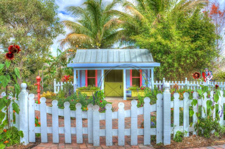 Keywords: garden house flowers green blue tropical palm trees architecture building exterior landscape summer outdoor nature gardening fence