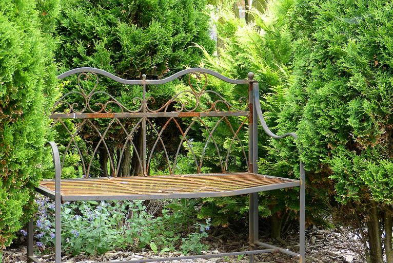 Keywords: garden nature bank stainless idyllic lonely green plant mourning rest garden bench silent style periwinkle