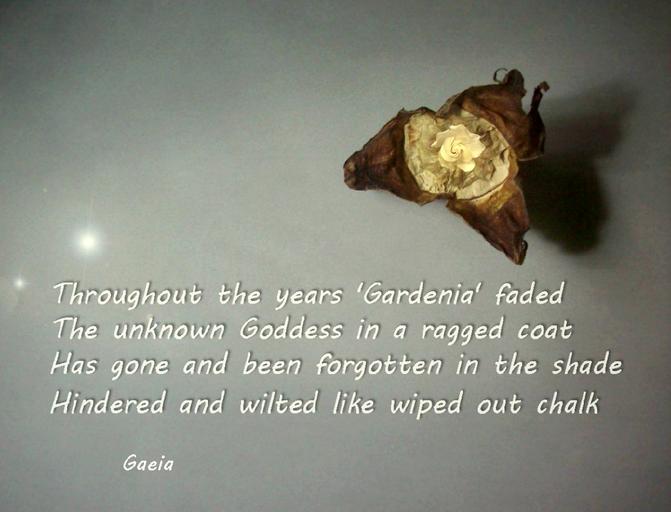 Keywords: inspired iggy pop iggypop gardenia song poem poetry words text verse thought gaeia vintage writing Throughout the years 'Gardenia' faded The unknown Goddess in a ragged coat Has gone and been forgotten into the shade Hindered and wilted as wiped out chalk Gaeia Inspired by Iggy Pop's song Gardenia Where are you? Black goddess in a shabby raincoat Where are you tonight? Cheap purple baby-doll dress A gardenia in your hair Much taller and stronger than me A forbidden dream, a dream, a dream Iggy Pop - Gardenia Published on 26 Mar 2016 youtu.be/79LnaLLLwnY Lyrics genius.com/Iggy-pop-gardenia-lyrics Throughout the years 'Gardenia' faded The unknown Goddess in a ragged coat Has gone and been forgotten into the shade Hindered and wilted as wiped out chalk Gaeia Inspired by Iggy Pop's song Gardenia Where are you? Black goddess in a shabby raincoat Where are you tonight? Cheap purple baby-doll dress A gardenia in your hair Much taller and stronger than me A forbidden dream, a dream, a dream Iggy Pop - Gardenia Published on 26 Mar 2016 youtu.be/79LnaLLLwnY Lyrics genius.com/Iggy-pop-gardenia-lyrics |