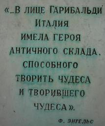 Keywords: Garibaldi Taganrog Plaque 1.jpg en Memorial plaque on Giuseppe Garibaldi's monument in Taganrog featuring a quotation from Friedrich Engels own ISasha ISasha Taganrog Plaques to Giuseppe Garibaldi Monuments and memorials in Taganrog Quotations Friedrich Engels |