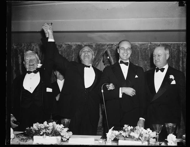 Keywords: Garner-Roosevelt-Roosevelt-Farley.jpg en Big Shots Washington D C February 15 Jim Farley's Testimonial Dinner Held Tonight At The Mayflower Brought The 'Tops' Of Washington's Government Leaders L To R Vice President Jack Garner President Roosevelt James Roosevelt and Jim Farley No known restrictions on publication Gift; Harris Ewing Inc 1955 1937-02-15 http //lcweb2 loc gov/service/pnp/hec/47200/47295v jpg Library of Congress Harris Ewing PD-Harris-Ewing Uploaded with UploadWizard James Roosevelt Franklin Delano Roosevelt in 1937 Franklin Delano Roosevelt standing after 1921 |