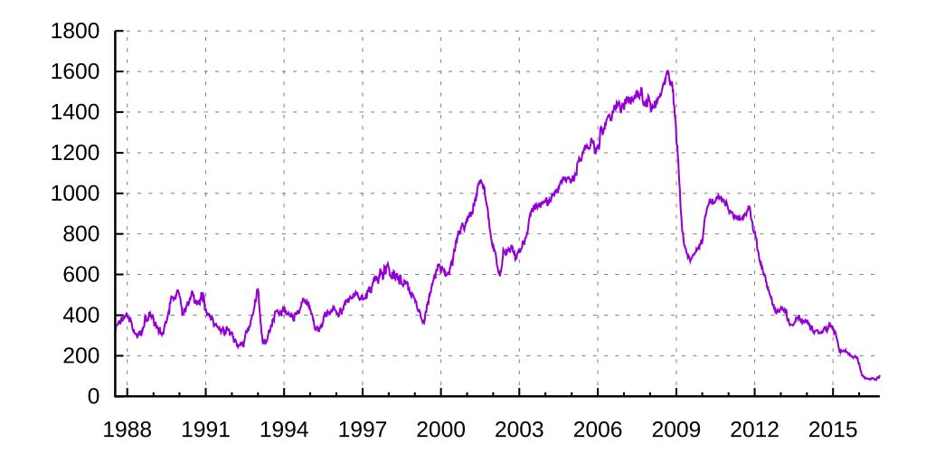| Keywords: Gas weekly USA.svg de Anzahl der aktiven Erdgasbohrstellen in den USA aufgezeichnet in wöchentlichen Intervallen seit dem 17 Juli 1987 Stand 14 Oktober 2016 ; Datenquelle Baker Hughes Incorporated North America Rig Count http //phx corporate-ir net/External File item UGFyZW50SUQ9NjQ4NDgxfENoaWxkSUQ9MzU0ODUzfFR5cGU9MQ t 1 Rohdaten als Excel-Datei Blatt žUS Oil Gas Split en Natural gas rig count in the United States recorded in weekly intervals since 17 June 1987 as of 14 October 2016 ; data source Baker Hughes Incorporated North America Rig Count http //phx corporate-ir net/External File item UGFyZW50SUQ9NjQ4NDgxfENoaWxkSUQ9MzU0ODUzfFR5cGU9MQ t 1 raw data as excel file sheet US Oil Gas Split 2015-02-11 own StefanPohl other versions cc-zero v data << EOD Source http //phx corporate-ir net/phoenix zhtml c 79687 p irol-reportsother Baker Hughes Gas Split Date Gas 1987-07-17 337 1987-07-24 331 1987-07-31 346 1987-08-07 349 1987-08-14 352 1987-08-21 354 1987-08-28 361 1987-09-04 369 1987-09-11 364 1987-09-18 367 1987-09-25 356 1987-10-02 367 1987-10-09 378 1987-10-16 391 1987-10-23 372 1987-10-30 374 1987-11-06 387 1987-11-13 393 1987-11-20 386 1987-11-27 389 1987-12-04 394 1987-12-11 399 1987-12-18 405 1987-12-25 412 1988-01-01 392 1988-01-08 390 1988-01-15 392 1988-01-22 390 1988-01-29 366 1988-02-05 381 1988-02-12 385 1988-02-19 377 1988-02-26 365 1988-03-04 360 1988-03-11 342 1988-03-18 326 1988-03-25 322 1988-04-01 330 1988-04-08 315 1988-04-15 310 1988-04-22 307 1988-04-29 308 1988-05-06 308 1988-05-13 299 1988-05-20 291 1988-05-27 295 1988-06-03 304 1988-06-10 310 1988-06-17 321 1988-06-24 301 1988-07-01 314 1988-07-08 318 1988-07-15 297 1988-07-22 308 1988-07-29 314 1988-08-05 340 1988-08-12 335 1988-08-19 342 1988-08-26 346 1988-09-02 381 1988-09-09 399 1988-09-16 396 1988-09-23 383 1988-09-30 370 1988-10-07 372 1988-10-14 373 1988-10-21 379 1988-10-28 391 1988-11-04 416 1988-11-11 403 1988-11-18 409 1988-11-25 395 1988-12-02 397 1988-12-09 390 1988-12-16 400 1988-12-23 400 1988-12-30 384 1989-01-06 375 1989-01-13 346 1989-01-20 354 1989-01-27 362 1989-02-03 363 1989-02-10 334 1989-02-17 350 1989-02-24 341 1989-03-03 337 1989-03-10 327 1989-03-17 314 1989-03-24 320 1989-03-31 341 1989-04-07 325 1989-04-14 304 1989-04-21 317 1989-04-28 305 1989-05-05 311 1989-05-12 310 1989-05-19 304 1989-05-26 323 1989-06-02 341 1989-06-09 353 1989-06-16 367 1989-06-23 368 1989-06-30 364 1989-07-07 373 1989-07-14 382 1989-07-21 399 1989-07-28 413 1989-08-04 420 1989-08-11 414 1989-08-18 463 1989-08-25 456 1989-09-01 474 1989-09-08 490 1989-09-15 486 1989-09-22 485 1989-09-29 489 1989-10-06 485 1989-10-13 475 1989-10-20 480 1989-10-27 482 1989-11-03 491 1989-11-10 487 1989-11-17 499 1989-11-24 514 1989-12-01 522 1989-12-08 523 1989-12-15 519 1989-12-22 505 1989-12-29 502 1990-01-05 488 1990-01-12 484 1990-01-19 462 1990-01-26 447 1990-02-02 434 1990-02-09 397 1990-02-16 413 1990-02-23 405 1990-03-02 409 1990-03-09 435 1990-03-16 424 1990-03-23 414 1990-03-30 425 1990-04-06 445 1990-04-13 447 1990-04-20 467 1990-04-27 451 1990-05-04 450 1990-05-11 458 1990-05-18 465 1990-05-25 485 1990-06-01 475 1990-06-08 489 1990-06-15 500 1990-06-22 516 1990-06-29 516 1990-07-06 509 1990-07-13 495 1990-07-20 496 1990-07-27 466 1990-08-03 457 1990-08-10 472 1990-08-17 459 1990-08-24 475 1990-08-31 453 1990-09-07 454 1990-09-14 466 1990-09-21 467 1990-09-28 470 1990-10-05 456 1990-10-12 453 1990-10-19 480 1990-10-26 488 1990-11-02 513 1990-11-09 480 1990-11-16 474 1990-11-23 513 1990-11-30 495 1990-12-07 495 1990-12-14 457 1990-12-21 427 1990-12-28 424 1991-01-04 432 1991-01-11 413 1991-01-18 410 1991-01-25 396 1991-02-01 409 1991-02-08 408 1991-02-15 407 1991-02-22 397 1991-03-01 400 1991-03-08 394 1991-03-15 374 1991-03-22 389 1991-03-29 393 1991-04-05 382 1991-04-12 383 1991-04-19 367 1991-04-26 347 1991-05-03 350 1991-05-10 353 1991-05-17 352 1991-05-24 361 1991-05-31 352 1991-06-07 344 1991-06-14 345 1991-06-21 340 1991-06-28 337 1991-07-05 332 1991-07-12 338 1991-07-19 328 1991-07-26 329 1991-08-02 314 1991-08-09 318 1991-08-16 326 1991-08-23 332 1991-08-30 339 1991-09-06 336 1991-09-13 309 1991-09-20 303 1991-09-27 306 1991-10-04 320 1991-10-11 317 1991-10-18 340 1991-10-25 341 1991-11-01 335 1991-11-08 329 1991-11-15 322 1991-11-22 333 1991-11-29 321 1991-12-06 299 1991-12-13 306 1991-12-20 312 1991-12-27 316 1992-01-03 313 1992-01-10 312 1992-01-17 291 1992-01-24 291 1992-01-31 265 1992-02-07 277 1992-02-14 279 1992-02-21 280 1992-02-28 273 1992-03-06 262 1992-03-13 249 1992-03-20 245 1992-03-27 242 1992-04-03 253 1992-04-10 251 1992-04-17 250 1992-04-24 251 1992-05-01 260 1992-05-08 256 1992-05-15 262 1992-05-22 257 1992-05-29 263 1992-06-05 256 1992-06-12 242 1992-06-19 264 1992-06-26 276 1992-07-03 291 1992-07-10 306 1992-07-17 320 1992-07-24 318 1992-07-31 317 1992-08-07 329 1992-08-14 326 1992-08-21 336 1992-08-28 333 1992-09-04 345 1992-09-11 346 1992-09-18 356 1992-09-25 377 1992-10-02 381 1992-10-09 399 1992-10-16 399 1992-10-23 403 1992-10-30 415 1992-11-06 429 1992-11-13 440 1992-11-20 469 1992-11-27 466 1992-12-04 470 1992-12-11 494 1992-12-18 528 1992-12-23 525 1992-12-30 527 1993-01-08 515 1993-01-15 467 1993-01-22 434 1993-01-29 401 1993-02-05 374 1993-02-12 350 1993-02-19 313 1993-02-26 300 1993-03-05 277 1993-03-12 257 1993-03-19 270 1993-03-26 267 1993-03-31 278 1993-04-08 278 1993-04-16 262 1993-04-23 265 1993-04-30 268 1993-05-07 278 1993-05-14 283 1993-05-21 298 1993-05-28 315 1993-06-04 325 1993-06-11 327 1993-06-18 321 1993-06-25 335 1993-07-02 353 1993-07-09 346 1993-07-16 346 1993-07-23 376 1993-07-30 380 1993-08-06 377 1993-08-13 371 1993-08-20 395 1993-08-27 417 1993-09-03 419 1993-09-10 421 1993-09-17 422 1993-09-24 420 1993-10-01 422 1993-10-08 414 1993-10-15 409 1993-10-22 402 1993-10-29 410 1993-11-05 418 1993-11-12 412 1993-11-19 401 1993-11-26 400 1993-12-03 427 1993-12-10 417 1993-12-17 433 1993-12-22 430 1993-12-29 423 1994-01-07 442 1994-01-14 420 1994-01-21 413