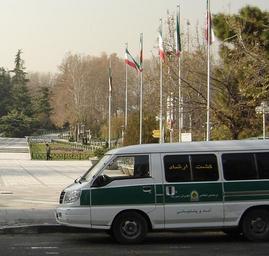 Keywords: Gasht Ershad.JPG An Iranian Police van in Tehran Iran On the side of the vehicle on the windows is written Morality guidance Patrol Own 2007-12 Zereshk Transport in Tehran Police automobiles in Iran Green and white police automobiles Morality Soueast Delica Photographs of flags of Iran |