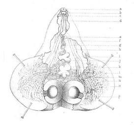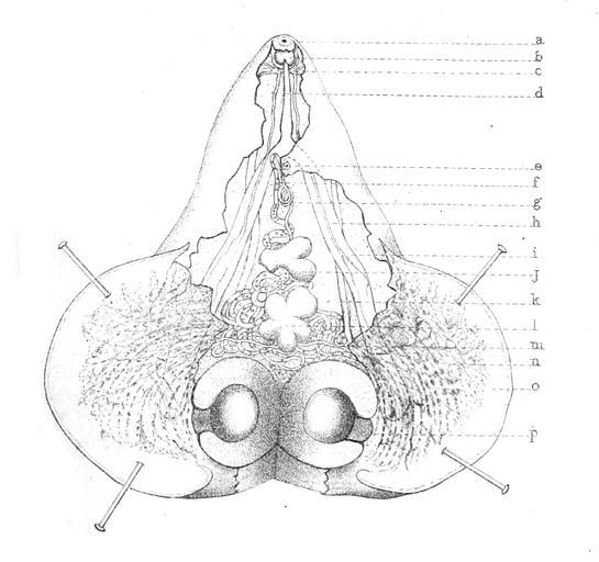 Keywords: Gastrodiscoides hominis longitudinal section.png en Longitudinal section of an adult Gastrodiscoides hominis Digenea Paramphistomata Gastrodiscidae a “ oral sucker consisting of a tranverselly placed oval orifice surrounded by a ring of muscular tissue and presenting in many specimens a slight papilla-like prominence; b “ bulbous heart-shaped pharynx with the apex directed anteriorly; c “ Nercous ganglia on the one side communicating with those of the other by means of a comparatively strong cord passing transversely behind oesophagus; d “ oesophagus bifurcating behind the genital pore; e “ genital pore situated posteriorly to oral sucker; f “ vagina filled with eggs in mature specimen; g “ ductus ejaculatorum h “ large nerve cords which may be traced along the ventral surface of the two intestinal canals; i “ two intestine canals caecally terminated about opposite the middle half of the caudal sucker; j “ testes; k “ water-vascular system closely attached to the intesine canal on either side connected with numerous fine canaculae; l “ ovarium; m “ main vitellogene ducts; n “ vitellogene ducts with dendriform arrangement; o “ p “ caudal sucker Lewis T R McConnell J F P 1876 Amphistoma hominis n sp A new parasite affecting man Proceedings of the Asiatic Society of Bengal 182 “186 http //www biodiversitylibrary org/page/34518656 Reprint 1876 Timothy R Lewis “1886 J F P McConnell 1848 “1896 PD-100 Gastrodiscoides hominis |