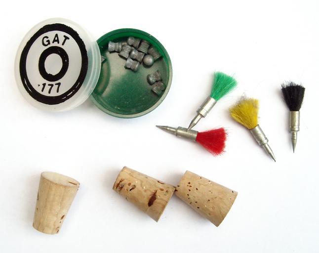Keywords: GatAmmo.JPG en Examples of the three types of ammunition supplied with the Gat air pistol - corks darts and pellets Though the box for the pellets is original the pellets may not be own Simon Speed 2013-06-26 Gat air pistols Air gun pellets Photos by Simon Speed Taken with Nikon Coolpix S520 Cc-zero |