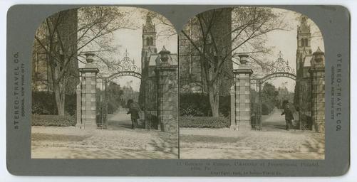Keywords: philadelphia stereographs university of pennsylvania universityofpennsylvania campus gates spruce street sprucestreet houston hall houstonhall Shows the gate on Spruce Street leading to the campus of University of Pennsylvania in Philadelphia, 1909. Pillars connected by iron-work doors flank either side of the gate at the western side of Houston Hall. The Latin phrase "inveniemus viam aut faciemus" adorns the arch of the entryway, under which a man walks. Accession number: P.2011.47.810 Shows the gate on Spruce Street leading to the campus of University of Pennsylvania in Philadelphia, 1909. Pillars connected by iron-work doors flank either side of the gate at the western side of Houston Hall. The Latin phrase "inveniemus viam aut faciemus" adorns the arch of the entryway, under which a man walks. Accession number: P.2011.47.810 |