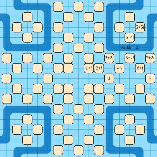 | Keywords: Gaussian moat 15x15.svg Gaussian primes with real and imaginary part at most seven showing portions of a Gaussian moat of width 2 separating the origin from infinity own David Eppstein 2012-04-27 Prime numbers Files by User David Eppstein from en wikipedia Cc-zero |