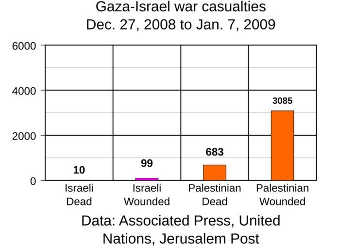 Keywords: Gaza-Israel war casualties.svg en SVG version of Image Gaza-Israel_war_casualties png Created with Inkscape v0 46 and edited by hand by me Edit with a text editor to update dates / data Edit by amending negative vertical line shift for bar plots <ul> <li>Current multiplication factor for bar height is x0 05</li> <ul><li>e g for 179 the distance for the bar height is 8 95</li></ul> <li>e g for Israeli Wounded </li> <path id barIsraeliWounded d M 300 400 l 50 0 l 0 -17 9 l -50 0 z - Edit this number <li>also update numerical value above bar e g valueIsraeliWounded </li> <ul><li>may need to adjust height of this text as well</li></ul> <li>Also update data for date s titleLine2 </li> </ul> Current data sources Associated Press United Nations Jerusalem Post are listed below Numbers in the chart for the wounded are for those with physical injuries The numbers in the chart do not include those who have only been psychologically injured or traumatized Associated Press http //www guardian co uk/world/feedarticle/8201821 Jan 6 2009 article Ten Israelis have died since the operation began United Nations http //www ochaopt org http //www ochaopt org/documents/ocha_opt_gaza_situation_report_2009_01_05_english pdf Jan 5 2009 report Overall close to 60 IDF soldiers have been wounded in Gaza since Saturday Jan 3 2009 http //www ochaopt org/documents/ocha_opt_gaza_humanitarian_situation_report_2009_01_07_english pdf Jan 7 2009 report Every other person in Gaza is a child 56 percent of the population and they remain dangerously exposed to the fighting around them At least 101 children have been killed almost one thousand injured and tens of thousands traumatized According to the MoH the total number of casualties as of 1400 hours today has risen to at least 683 Palestinians killed and more than 3 085 injured since 27 December Jerusalem Post Jan 6 2009 article titled Rocket slams into Ashdod kindergarten discusses casualties caused by rockets http //fr jpost com/servlet/Satellite cid 1231167267556 pagename JPost/JPArticle/ShowFull Four Israelis have been killed 10 moderately to seriously wounded and 29 slightly wounded Another 144 have been treated for shock Image Gaza-Israel_war_casualties png Gringer <span class signature-talk >talk</span> 02 08 8 January 2009 UTC 2009-08-01 Image Gaza-Israel_war_casualties png Casualty statistics of the 2008-2009 Gaza War |