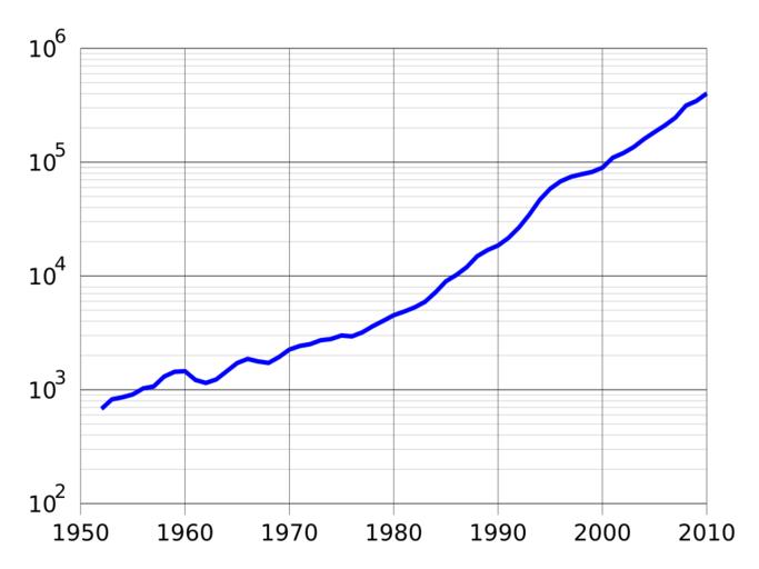 Keywords: GDP of China in hundred million RMB-semilog.svg en GDP of China from 1952 to 2010 in hundred million Yuan Renminbi Data from http //www chinability com/GDP htm GDP growth in China 1952-2011 2014-12-15 own Delphi234 other versions File GDP of China in RMB-semilog svg in billion Yuan cc-zero Uploaded with UploadWizard Economy of the People's Republic of China GDP chart Diagrams labelled with numbers only |