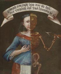 | Keywords: Gedenck O Mensch sich wer Du bist.jpg Gedenck O Mensch Sich wer Du bist/Wie ungleich Dott und Lebendig ist Öl auf Leinwand 46 x 38 2 cm süddeutsch 18 Jahrhundert eine weitere Fassung dieser Komposition zusammen mit dem männlichen Gegenstück befindet sich im Städtischen Museum Rosenheim Remember O Man Look who you are / How unequal Dead and Alive are oil on canvas 46 x 38 2 cm; South Germany 18th century another version of this invention with a male counterpart is part of the collection of the Heimatmuseum in Rosenheim Bavaria; image http //www dorotheum com Dorotheum century 18 anonymous PD-old-100 Skeletons in art Memento mori 18th-century paintings not categorised by year Front views of women in art 18th-century paintings location missing Images from Dorotheum |