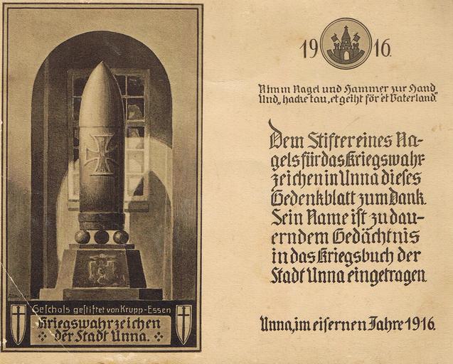 Keywords: Gedenkblatt- Kriegswahrzeichen der Stadt Unna.jpg 2011 fand ich auf dem Dachboden des Hauses meiner Urgroßeltern eine alte Schachtel in der viele unbeschriebene und unbeschriebene Postkarten schwarz-weiß Fotos und unbenutzte Briefumschläge befanden Nach einigem wühlen stieß ich auf das Gedenkblatt Es zeigt das Nagelbild der Stadt Unna in Form eines Artillerie-Geschosses Da es keine Verwandten mehr gibt die wissen könnten wie das Gedenkblatt dorthin gekommen ist recherchierte ich im Stadtarchiv Unna und im Hellweg Museum-Unna Krupp-Essen stiftete der Stadt Unna eine überdimensionale hölzerne 42-Zentimeter Artilleriegranate das Geschoss der žDicken Bertha Das žKriegswahrzeichen der Stadt sollte zum einen Spenden für den Liebesgabendienst bringen zum anderen ein žfür alle Zeiten ein bleibendes Zeichen der Erinnerung an die jetzige žgroße Zeit unseren kommenden Geschlechtern in der Stadt Unna überliefern Am 25 Januar 1916 erfolgte die Grundsteinlegung Die Granate wurde auf einem Sockel aufgestellt Das Nagelbild war hohl und bestand aus Erlenholz Zur rechten und linken des Denkmals wurden zwei Beutegeschütze älteren Typs aufgestellt Die Nagellöcher waren zwecks einfacherer Handhabung schon vorgebohrt Insgesamt konnten etwa 17 000 Nägel in die Granate gehauen werden bei Anbringung von Vereins- Familien- oder Geschäfts-Schilder entsprechend weniger Die Einweihung erfolgte am 30 Januar 1916 Als Weiheredner trat Generalmajor von Oertzen auf Das nageln am Einweihungstag selbst war den Honoratioren der Stadt vorbehalten Der Spender erhielt daraufhin ein Gedenkblatt und erhielt einen Eintrag im extra angeschafften žEisernen Buch der Stadt Unna befindet sich heute im Stadtarchiv Unna Vermutlich wird es so in den Besitz meines Urgroßvaters Ernst Ritter oder meiner Urgroßmutter gekommen sein Auf dem Gedenkblatt wurde an den Patriotismus der in der Heimat verbliebenen appelliert žNimm Nagel und hammer zur Hand / Und hacke tau et geiht för 'et Vaterland Der Spruch für das Gedenkblatt stammte von Johanna Hergershausen aus der jüdischen Gemeinde In den folgenden Monaten wurde die Nagelung des Kriegswahrzeichens von vermögenden Bürgern und Familien Vereinen und Schulen zelebriert Ein weiteres Exemplar des Gedenkblatts ist im Hellweg-Museum Unna erhalten exhibition history object history object type Europeana 1914-1918 Copyright information Europeana 1914-1918 PD-own upload Europeana claims no rights in its digitisation in accordance with its http //pro europeana eu/publications/the-europeana-public-domain-charter Public Domain charter Europeana 1914-1918 project place of creation place of discovery http //www europeana1914-1918 eu/en/contributions/3995 Gedenkblatt Kriegswahrzeichen der Stadt Unna Uploaded with GWToolset Gedenkblatt Kriegswahrzeichen der Stadt Unna http //www europeana1914-1918 eu/attachments/48036/3995 48036 full jpg World War I World War I homefront World War I propaganda Europeana 1914-1918 batch upload needs checking |