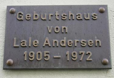 Keywords: Gedenktafel Lale Andersen.jpg Gedenktafel an Lale Andersens Geburtshaus in Bremerhaven-Lehe Lutherstraße 3 Memorial tablet for the German singer Lale Andersen at her birthplace in Bremerhaven Lutherstraße 3 Plaque commémorative sur la maison natale de la chanteuse allemande Lale Andersen à Bremerhaven Placa conmemorativa que recuerda a la cantante alemana Lale Andersen en su casa natal Minnestavla på Lale Andersens födelsehus i Bremerhaven Lutherstraße 3 Own 2006-11-04 Garitzko Lale_Andersen Plaques in Bremerhaven Lehe Bremerhaven Here-was-born plaques in Germany |